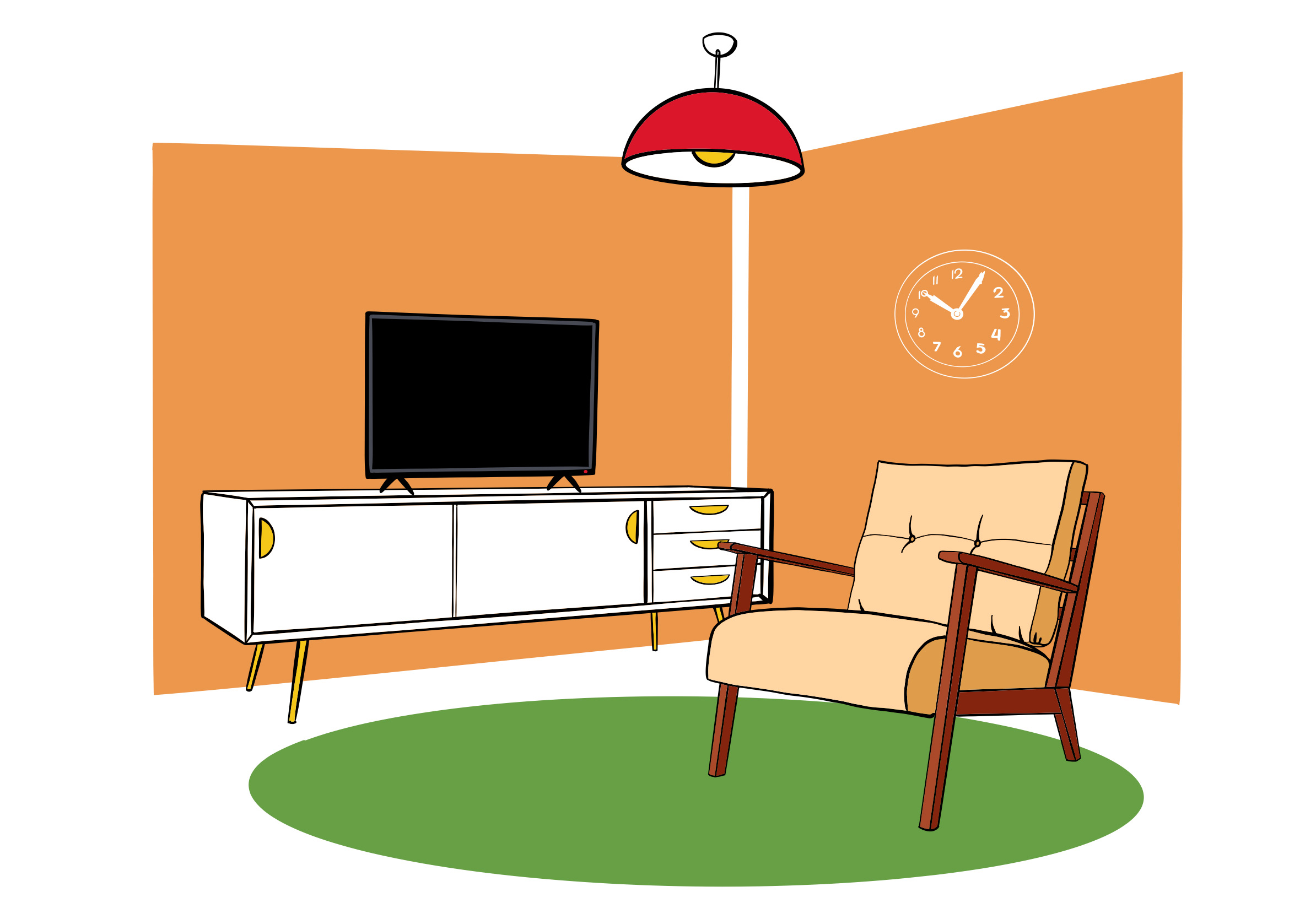 In deinem Wohnzimmer gibt es viele gemütliche Dinge! Hier stehen ein weiches Sofa, auf dem du sitzen und entspannen kannst, ein Fernseher, um deine Lieblingssendungen zu schauen, und vielleicht sogar ein paar bunte Kissen und Bilder an den Wänden, die den Raum schön machen.